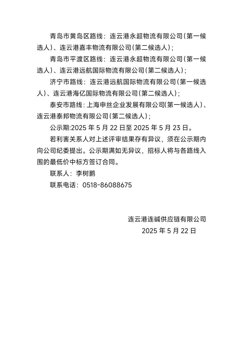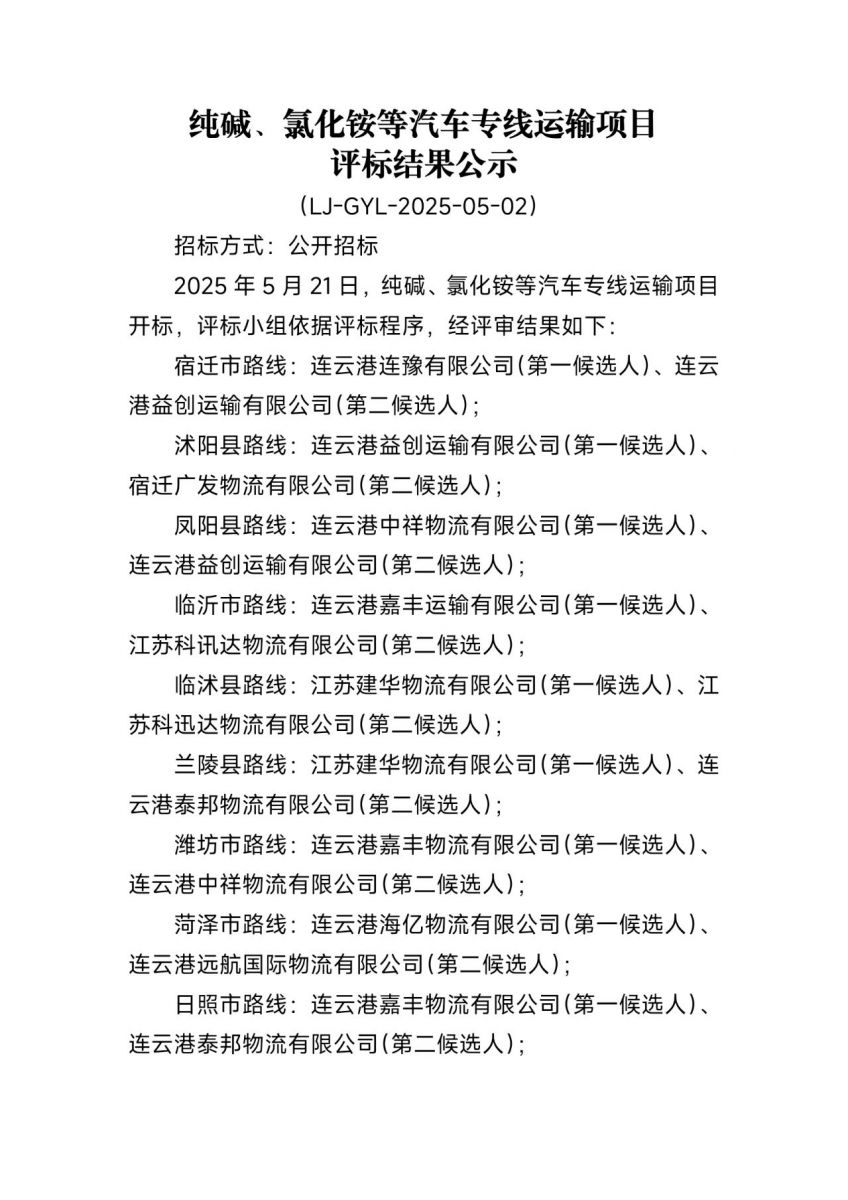 連云港連堿供應(yīng)鏈有限公司純堿、氯化銨等汽車專線運(yùn)輸項(xiàng)目評標(biāo)結(jié)果公示