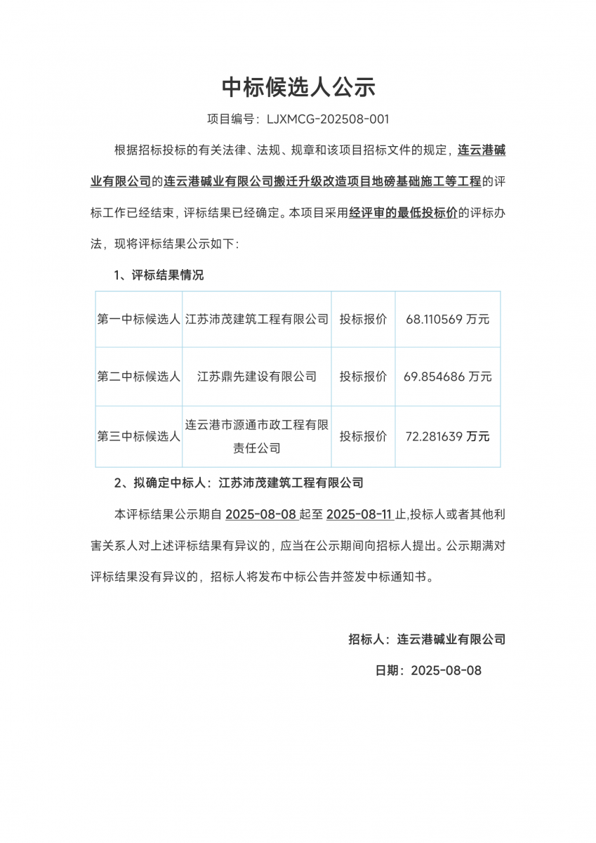搬遷升級改造項目地磅基礎施工等工程中標候選人公示